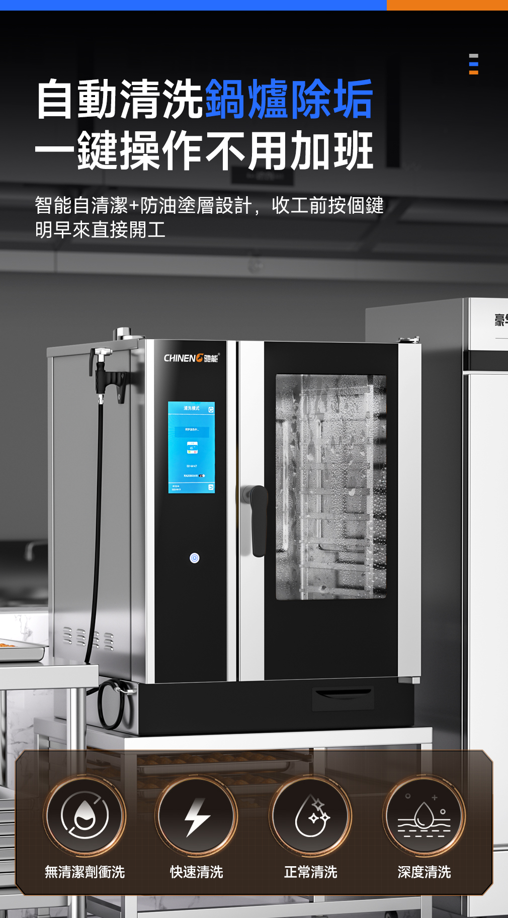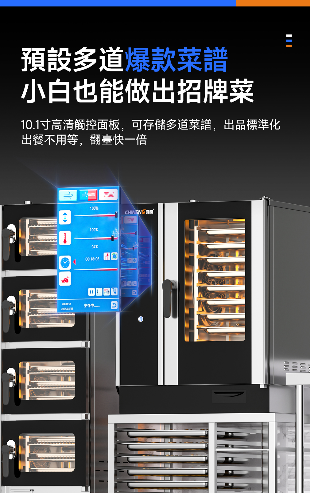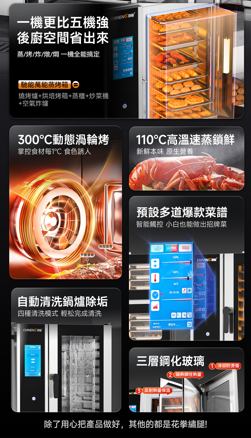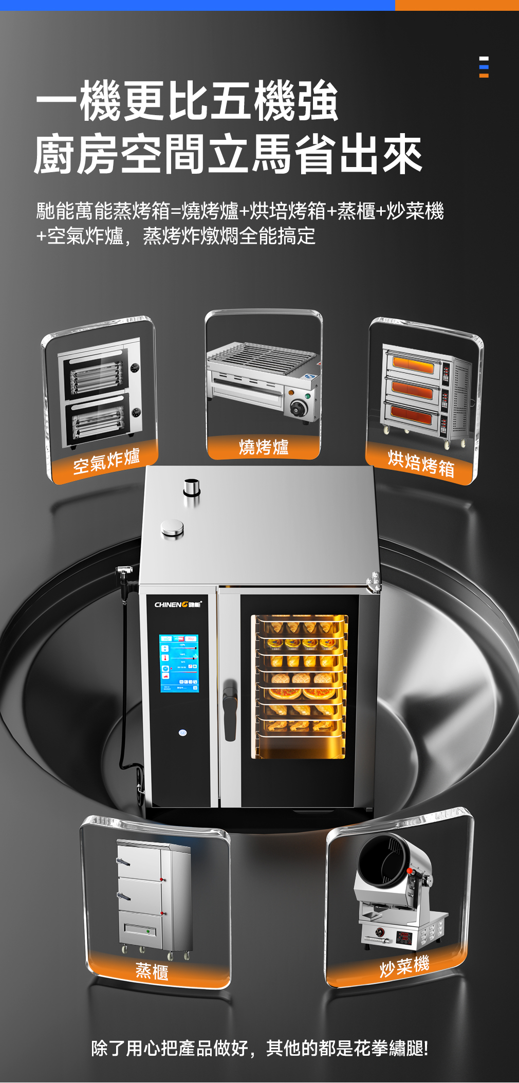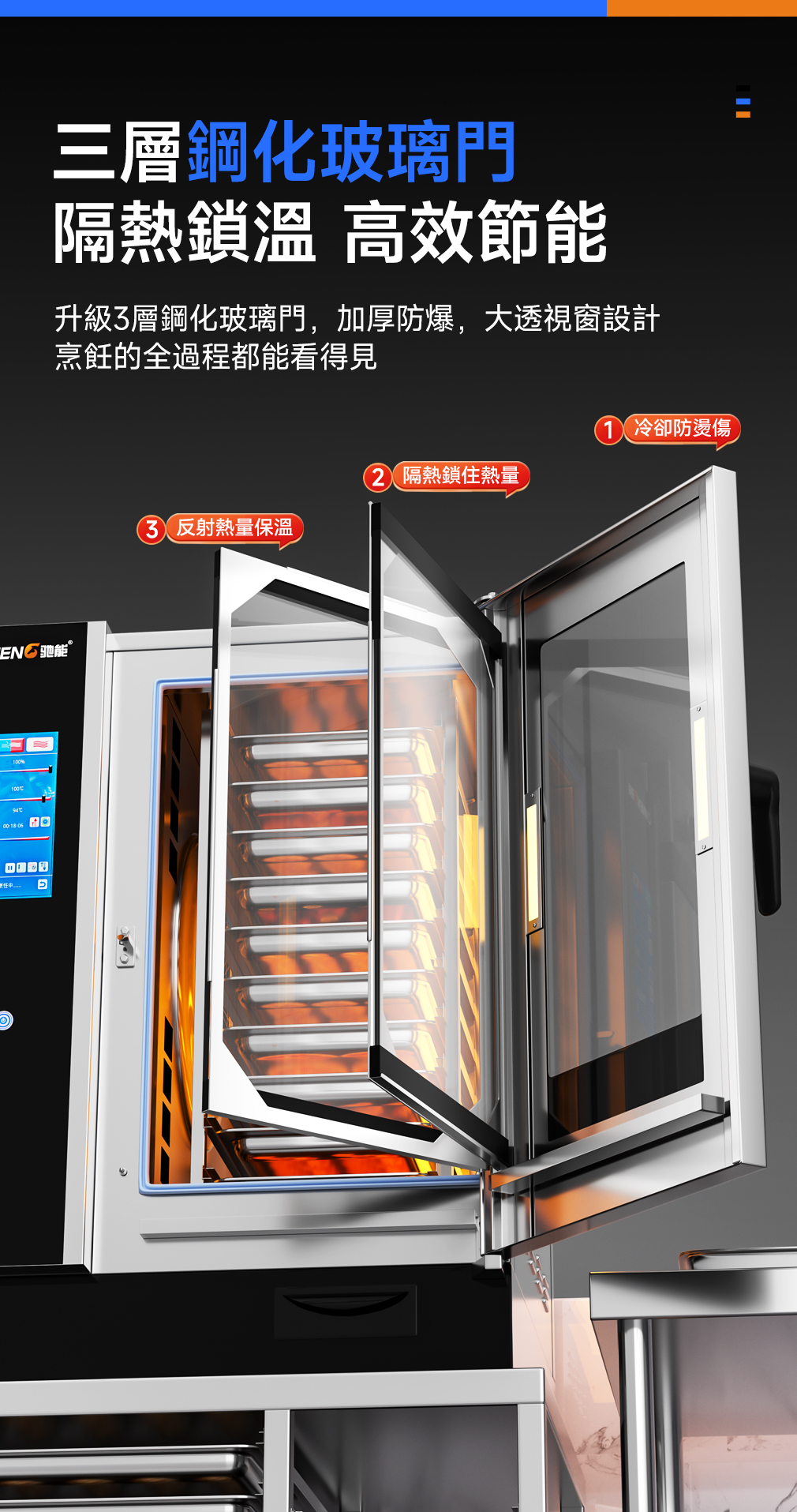 高效節能:與傳統設備相比,馳能萬能蒸烤箱能節省高達60%的能源,烹制食物時也無油煙,非常環保。