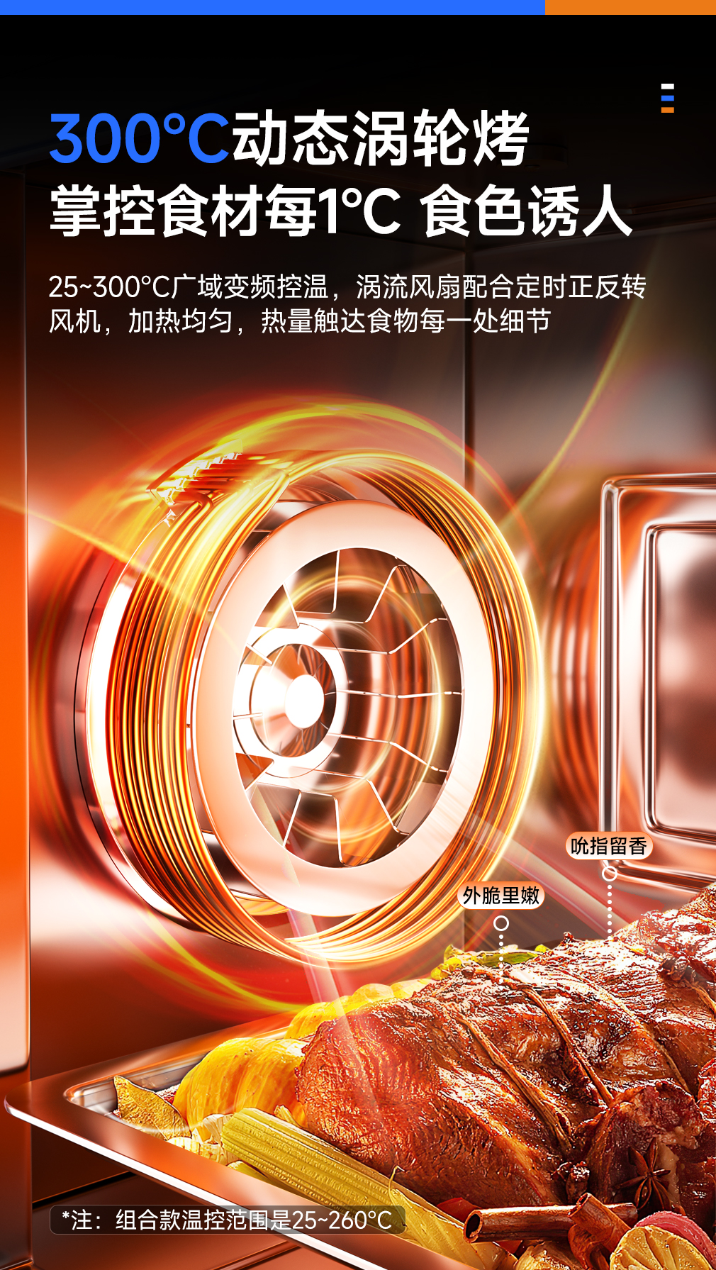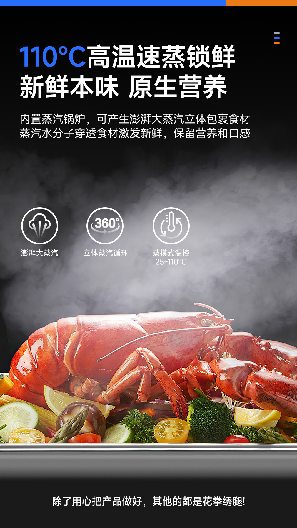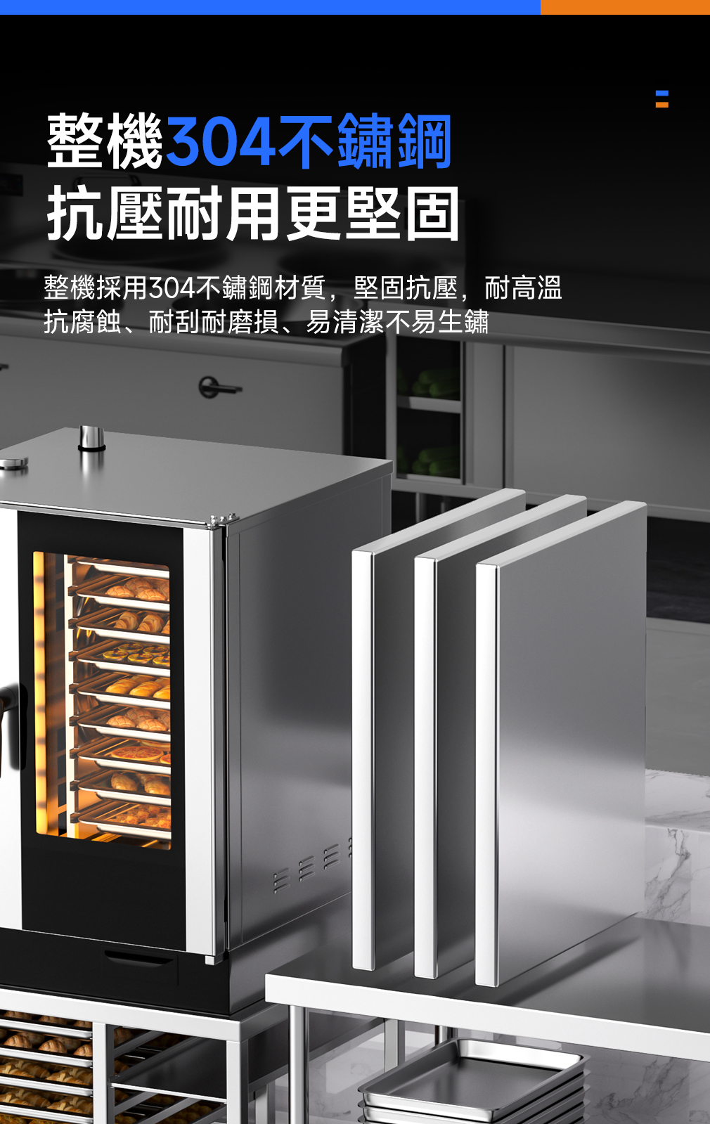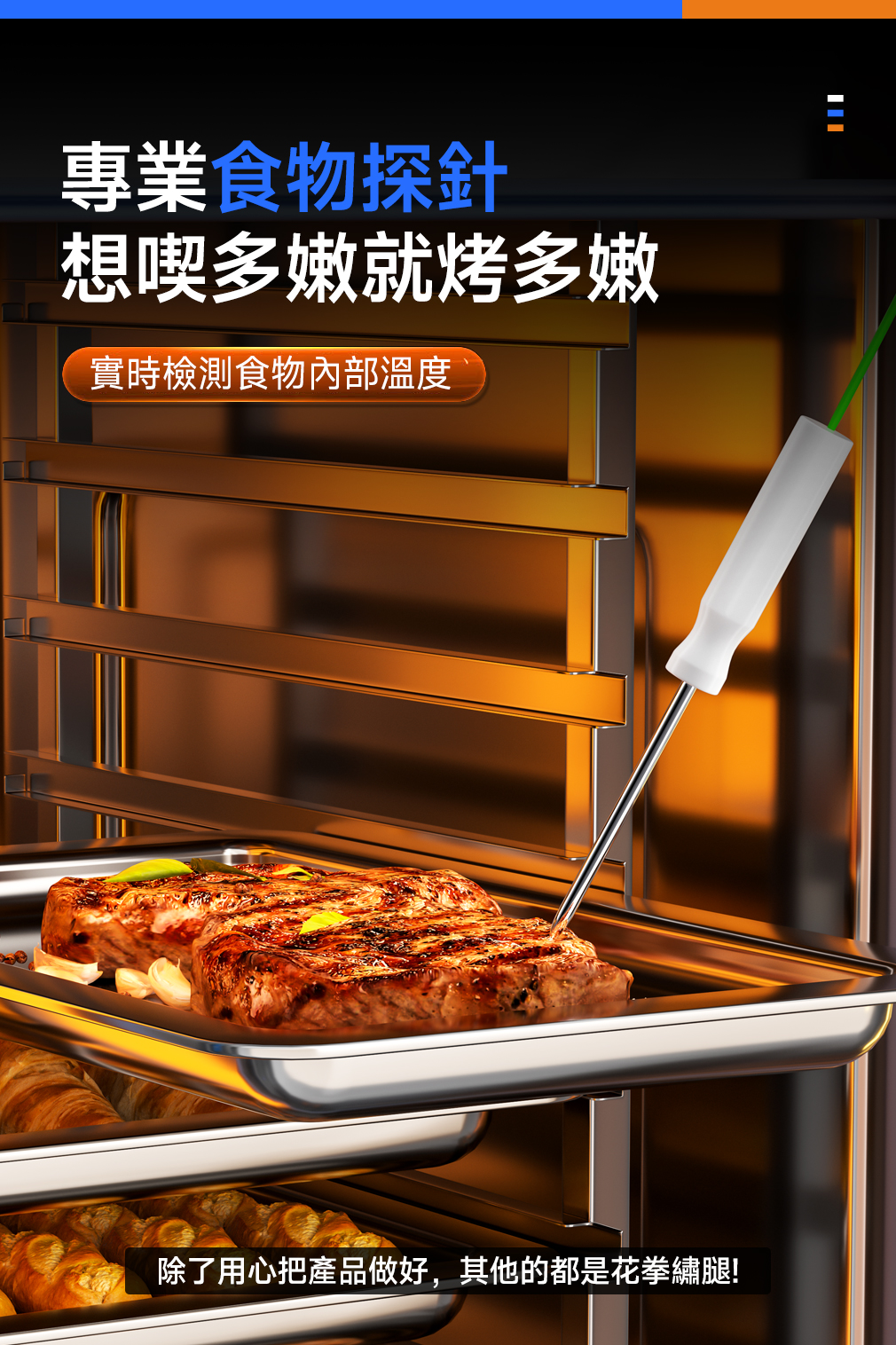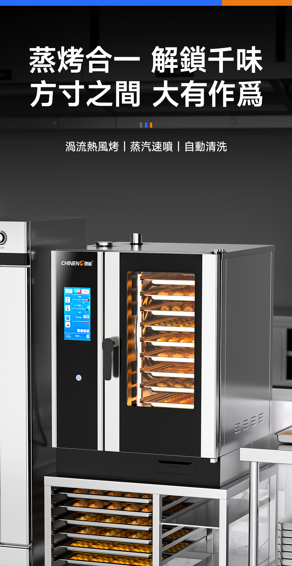 蒸烤一體:馳能萬能蒸烤箱具備蒸烤和烤蒸兩種模式,通過精細地控制蒸烤的溫度和烤箱內的溼度來烹飪食材,從而讓食材達到最佳的口感。