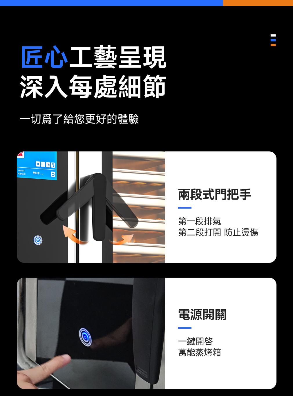 安全保護:設備在運作時溫度會很高,馳能萬能蒸烤箱爲了防止誤觸誤開,設置了特殊的安全保護機制,開門時會自動斷電。