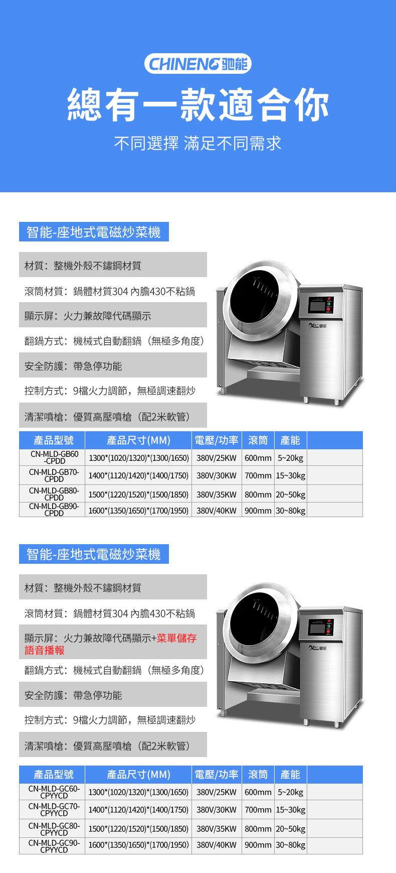 高效加熱:馳能大型炒菜機配備高功率加熱系統,能夠快速加熱食材,提高工作效率。
