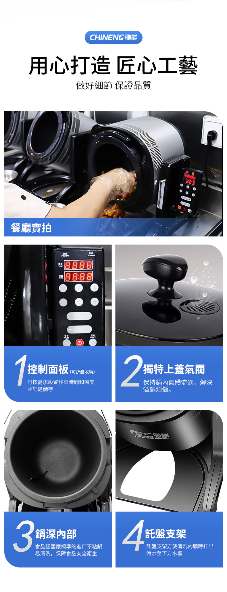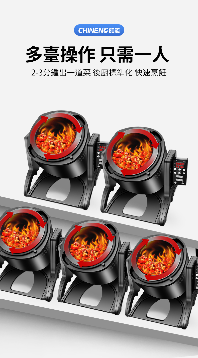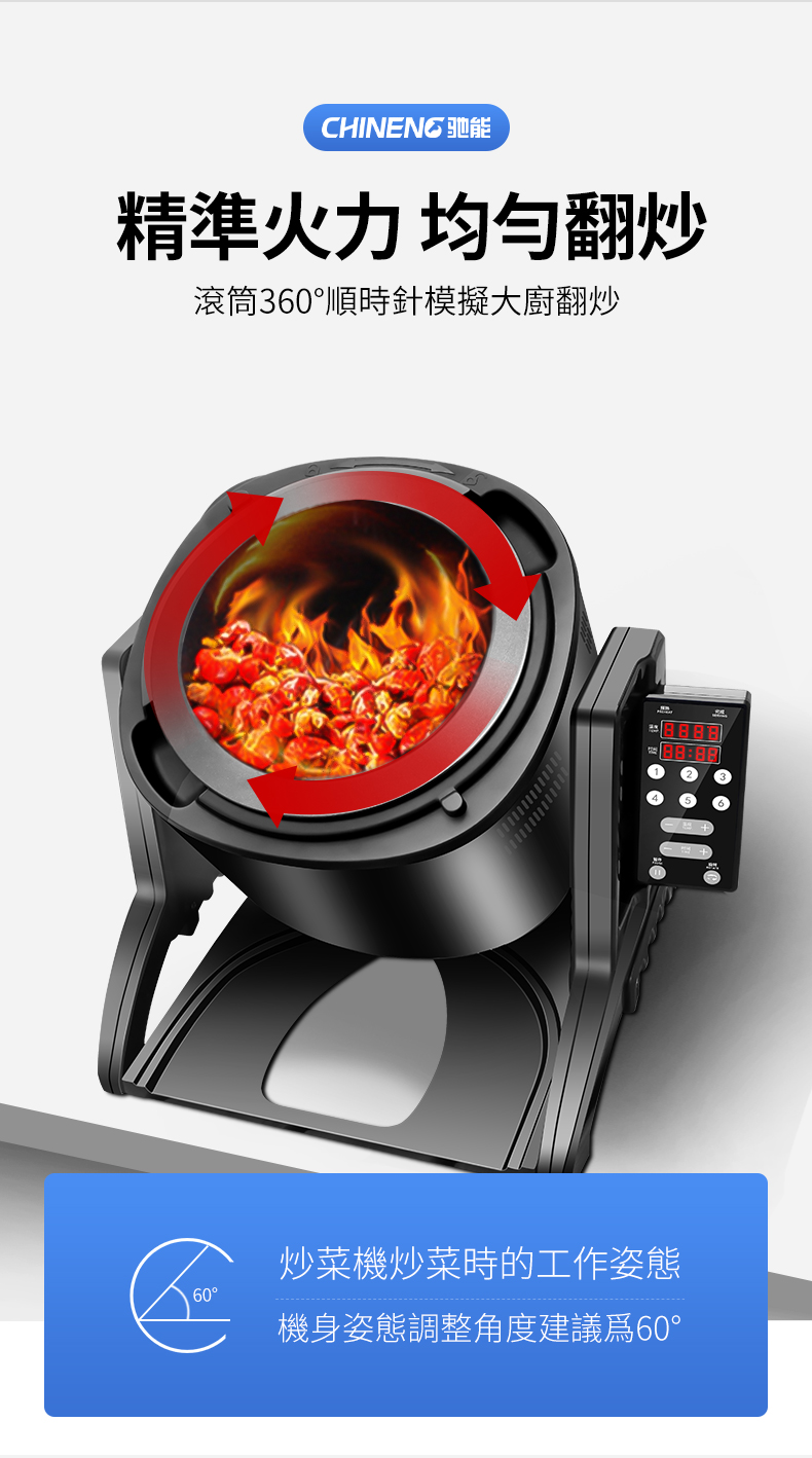 全自动化炒菜功能:馳能家商兩用炒菜機具備智能化的翻炒、火力與時間控制功能,能夠精準調控烹飪過程,確保每道菜品的口味穩定。其獨特的360度翻炒技術,可以模擬人工炒菜的手法,避免食材焦糊或不均勻加熱的問題,提高菜品的品質。