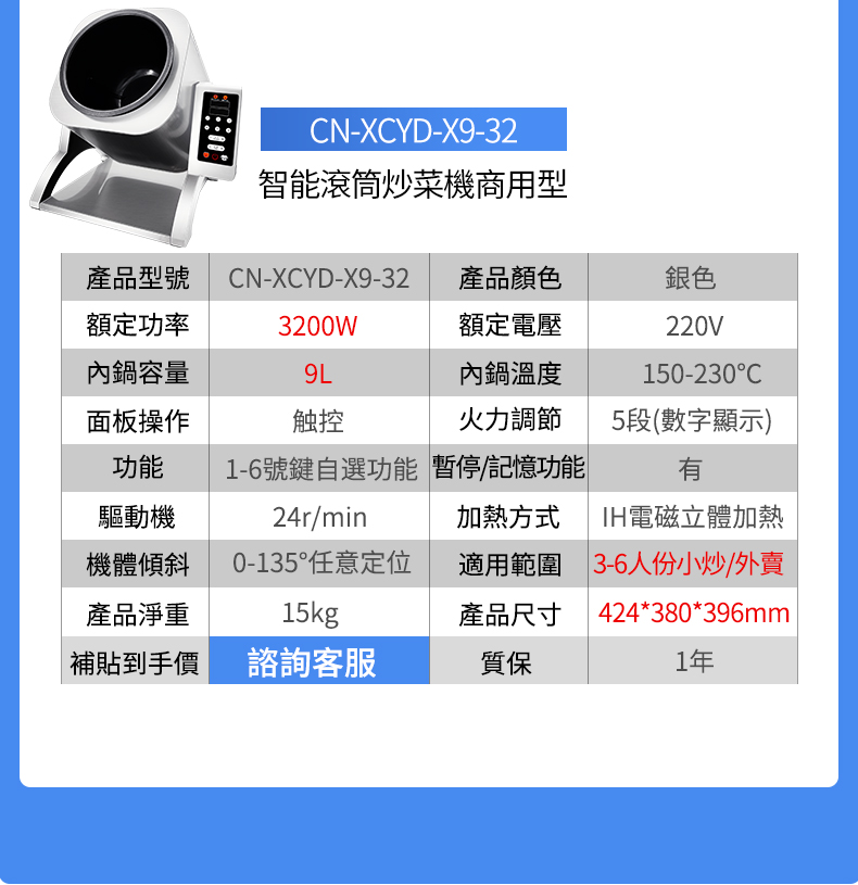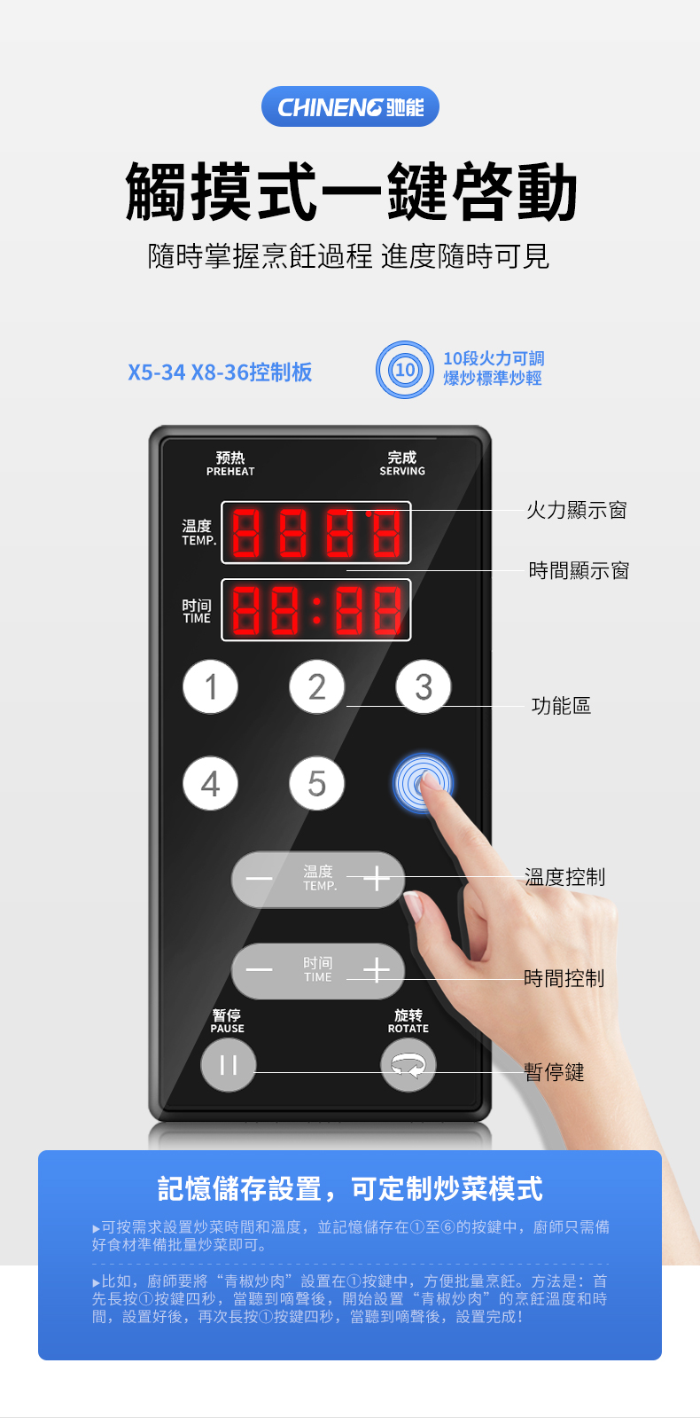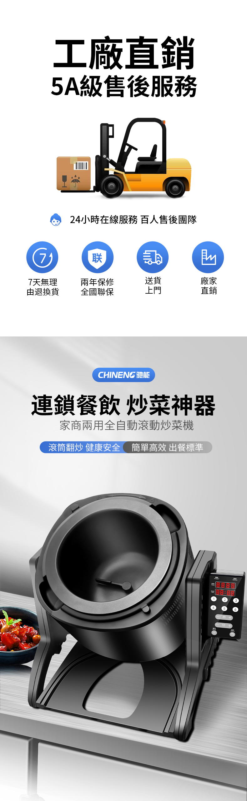 全自动化炒菜功能:馳能家商兩用炒菜機具備智能化的翻炒、火力與時間控制功能,能夠精準調控烹飪過程,確保每道菜品的口味穩定。其獨特的360度翻炒技術,可以模擬人工炒菜的手法,避免食材焦糊或不均勻加熱的問題,提高菜品的品質。