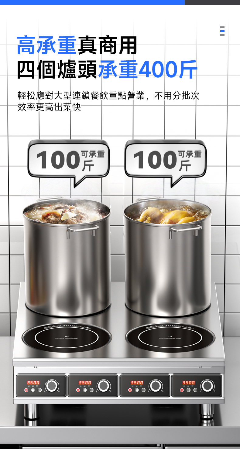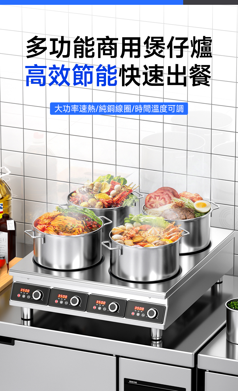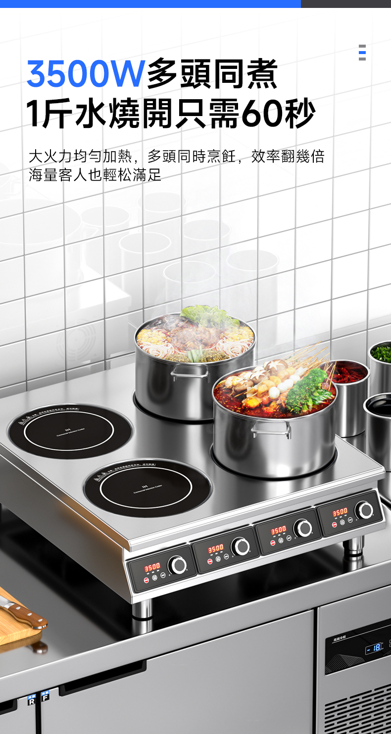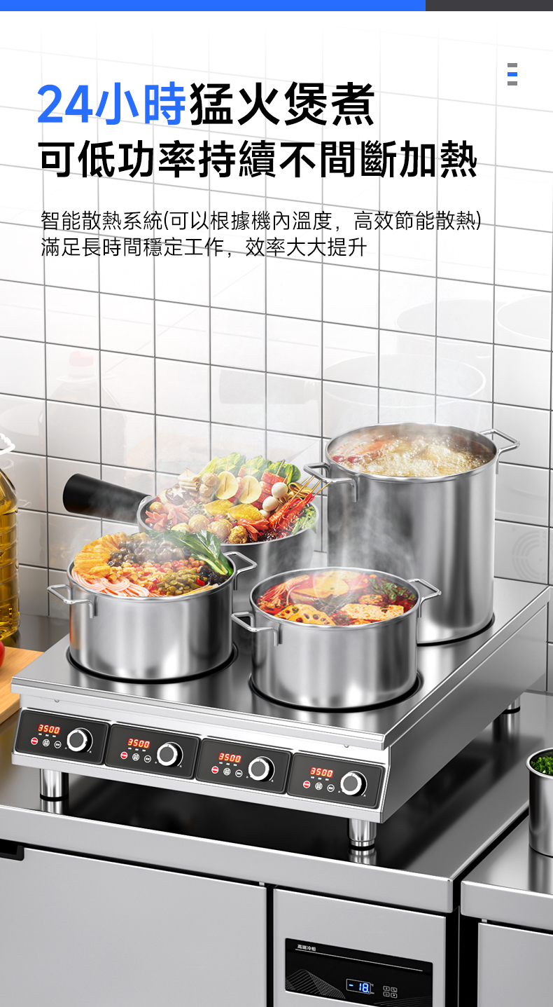 選擇多樣:有多種功率可供選擇,常見的如四頭、六頭、八頭的立式電磁煲仔爐,每個爐頭的功率一般在 2.5kW - 3.5kW 左右,可根據實際使用需求和廚房的電力負荷進行選擇