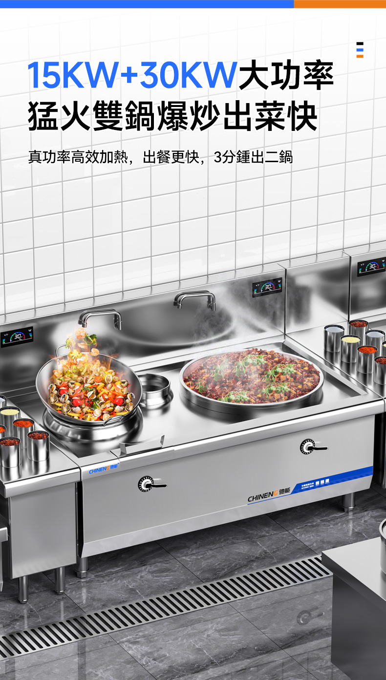 馳能商用電磁大小炒組合爐集成了大炒爐和小炒爐的功能於一體,旨在滿足商用廚房對高效、節能、環保和多功能性的需求。該組合爐採用先進的電磁加熱技術,具有熱效率高、加熱速度快、溫度控制精確等優點,是酒店、餐館等商用廚房的理想烹飪工具。