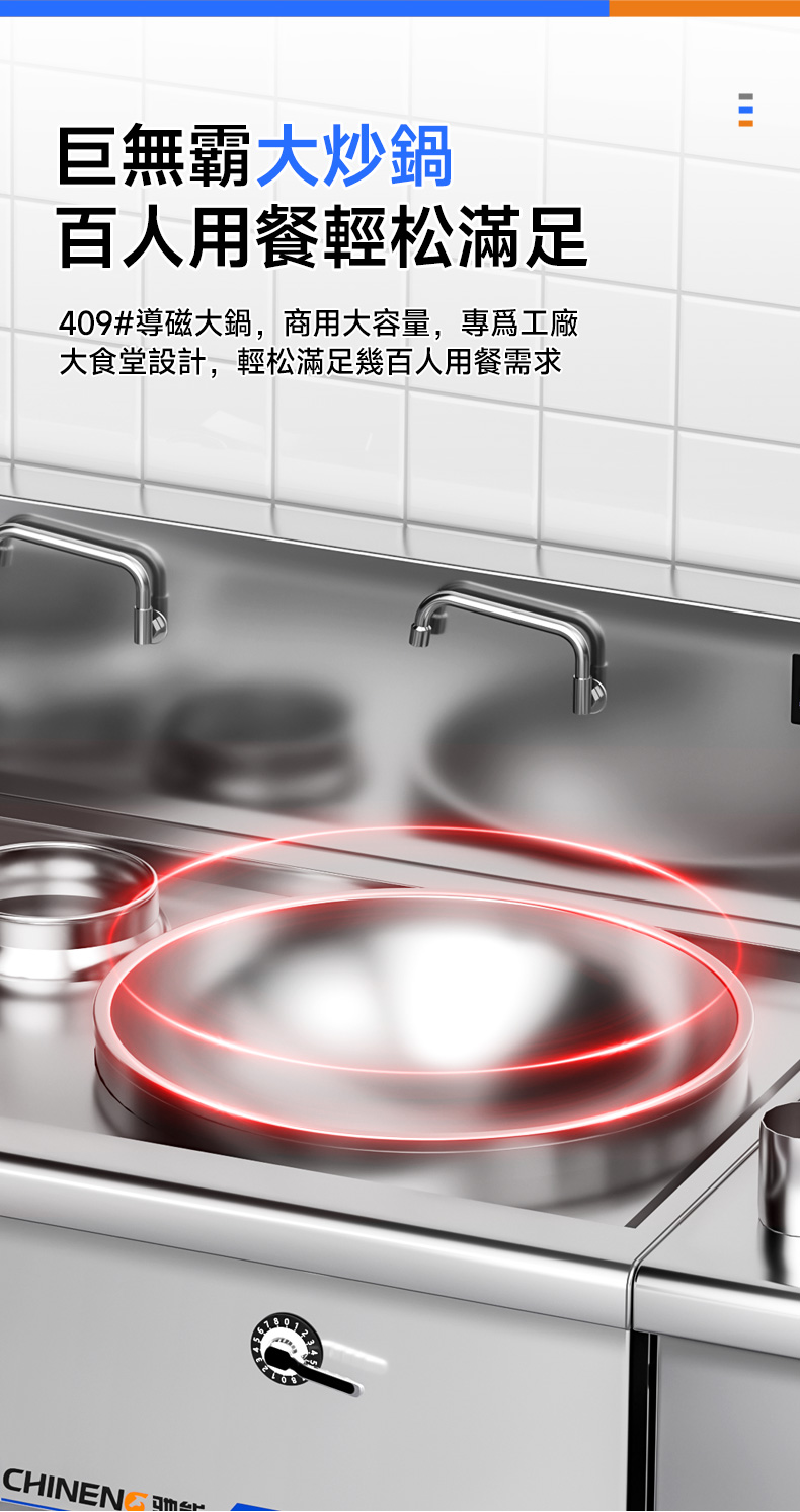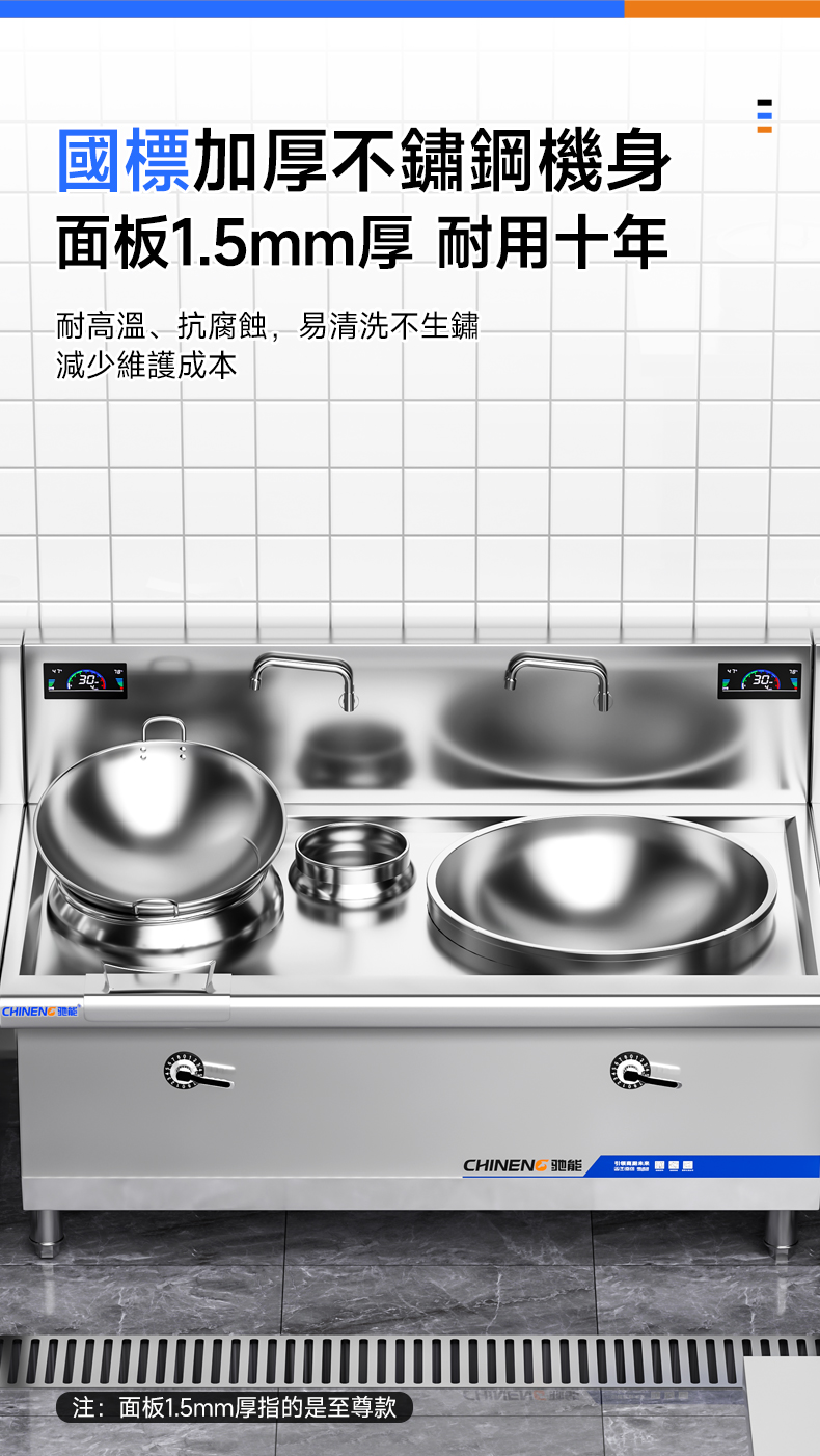 易於清潔和維護:馳能商用電磁大小炒組合爐的表面通常採用易於清潔的材料制成,使得清潔工作變得簡單快捷。同時,它的內部結構也相對簡單,易於維護和保養。