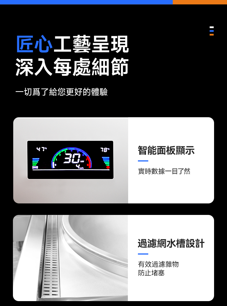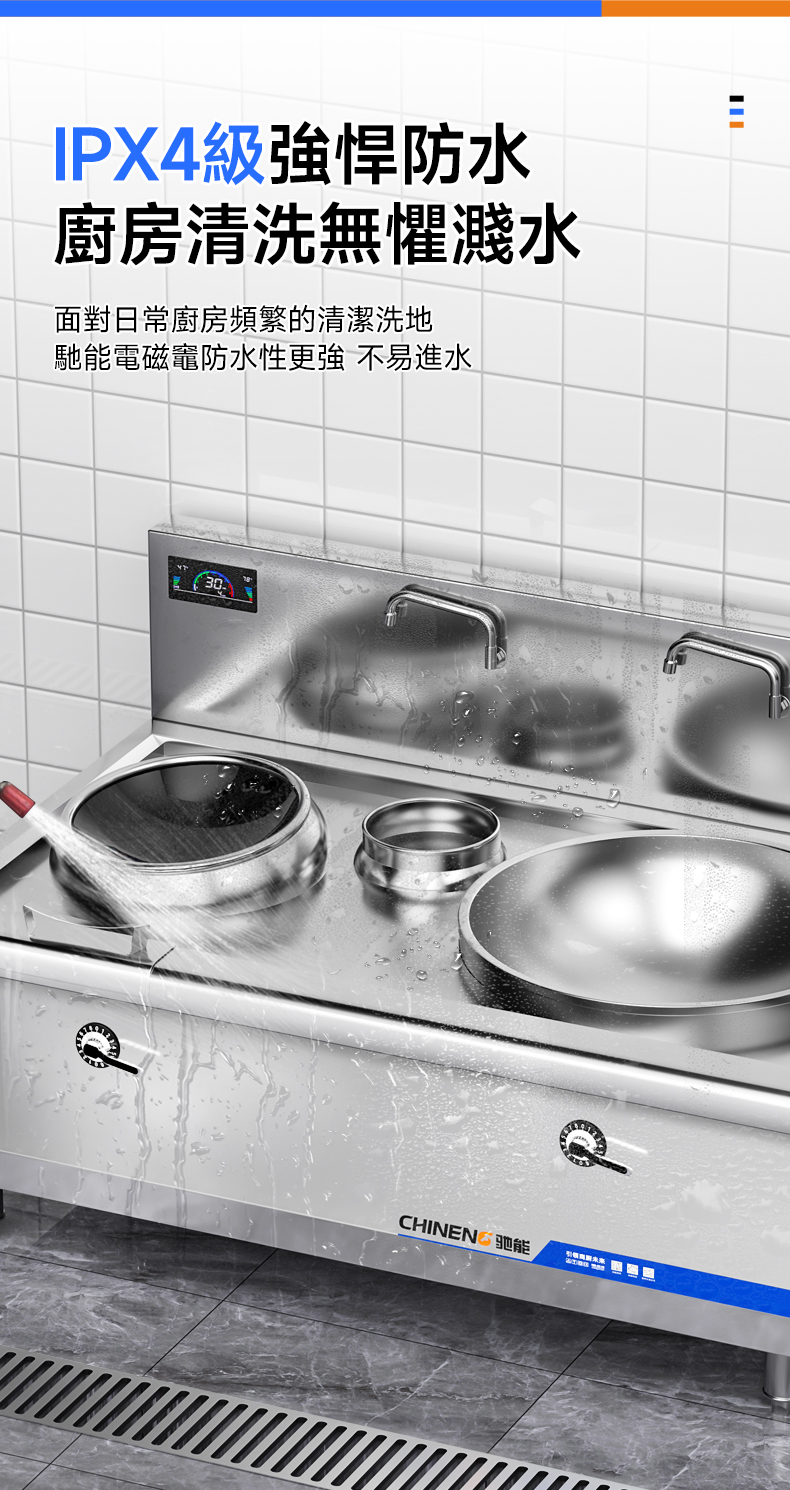 溫度控制精確:馳能商用電磁大小炒組合爐配備了先進的溫度控制系統,可以根據不同的烹飪需求靈活調節溫度。這種精確的溫度控制有助於廚師更好地掌握火候,烹制出更加美味的佳餚。